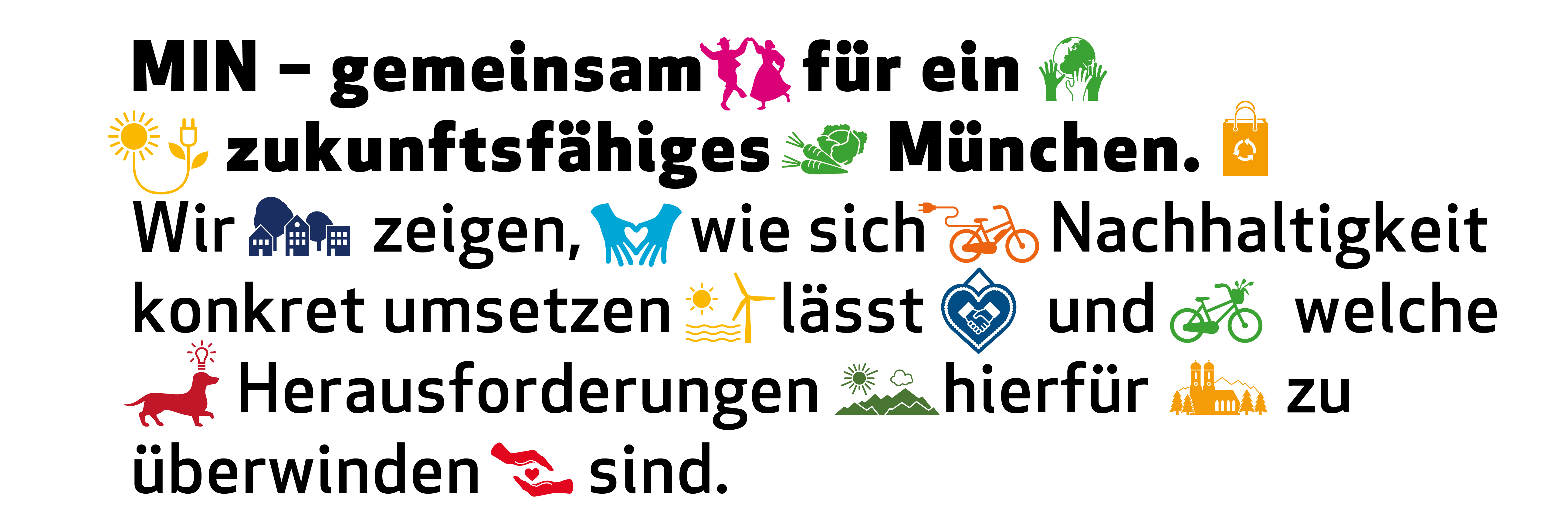 MIN setzt auf gemeinsame Entwicklung und Bündelung von Kräften, um mehr Wirkung zu entfalten. Gemeinsam mit der Kommunalpolitik, der Stadtverwaltung, der örtlichen Wirtschaft, der Wissenschaft und weiteren Organisationen ist MIN bereit, sich aktiv zu beteiligen an Planung, Umsetzung und regelmäßiger Fortschreibung einer jetzt zu entwickelnden Nachhaltigkeitsstrategie für München.