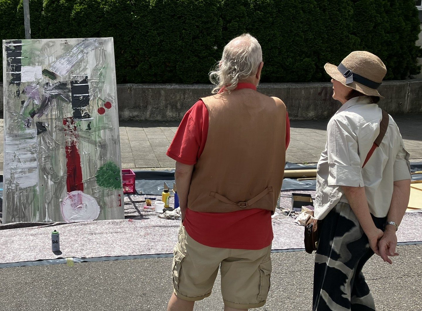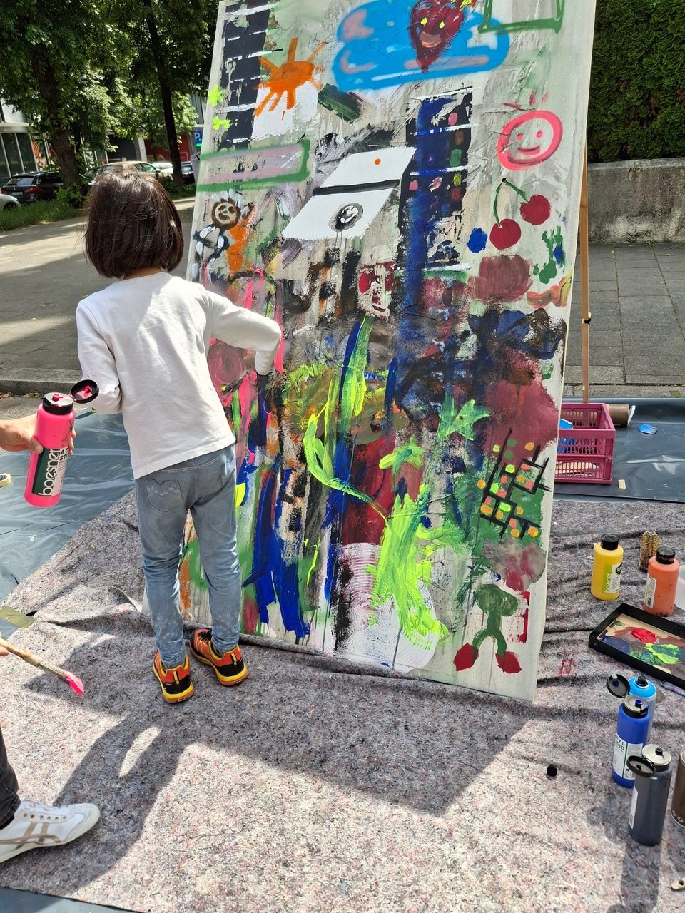 Ein echter Hingucker war Lucas Kuhns Malwand. Anfangs noch eine weiße Fläche, später eine wachsende Farbgeschichte, an der Groß und Klein mitpinseln durften. Ab 15 Uhr übernahmen die Kleinsten das Kommando, inklusive einer dicken braunen Farbschicht über allem. Luca konnte es am Ende noch retten. „Nächstes Mal gibt’s einfach zwei Wände: eine für kleine Farbwunder und eine für große Malträume“, ist das Learning von Sylvia Hladky, die Projektverantwortliche von der MIN.