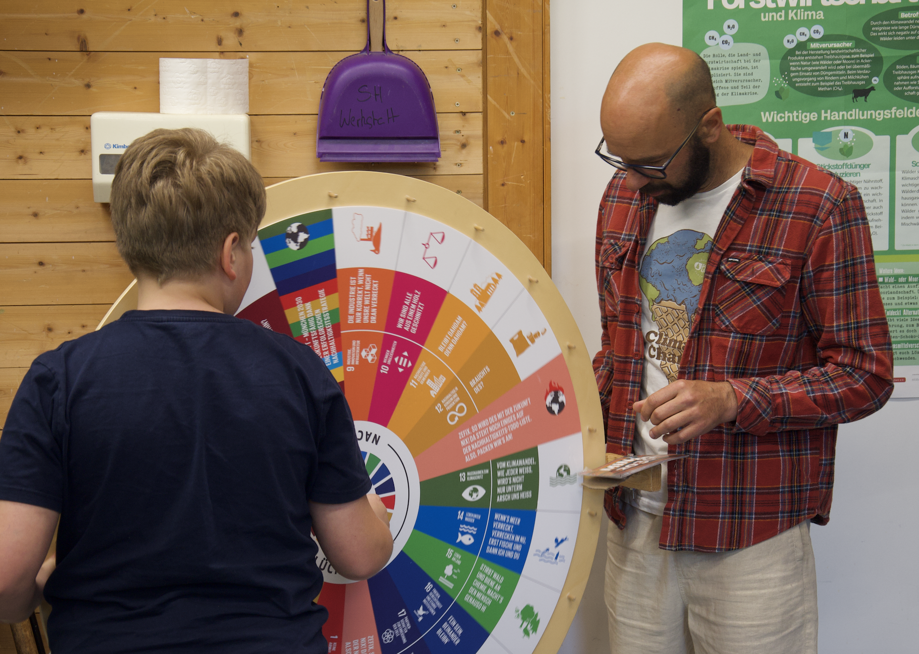 Jonas Bischofberger und Benjamin Hilbig, beide in der berufsbegleitenden Weiterbildung zu Bildung für nachhaltige Entwicklung (BNE) und Umweltbildung, haben das Kinder-Glücksrad als Projektarbeit für die MIN übernommen. Die Fragen, die auf der drehbaren Scheibe landen, entstehen zusammen mit Kindern.