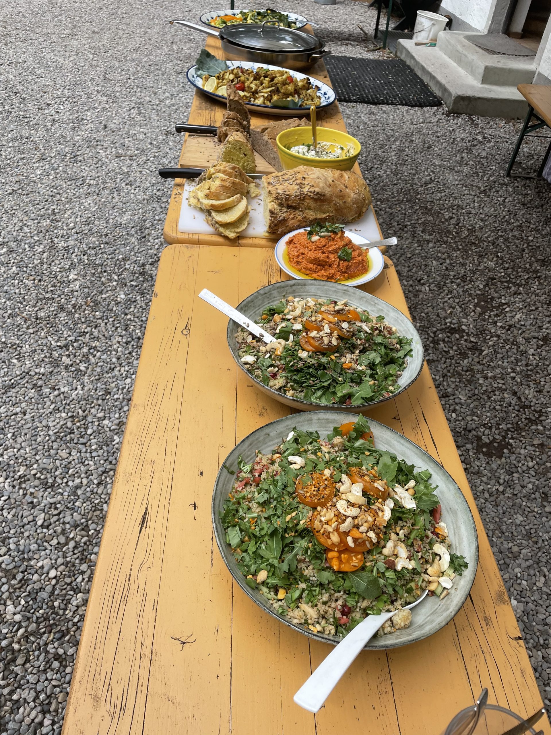 Mittags verwöhnte uns die wunderbare Annelie vom Osterseelchen mit leckerem Buffet. Gestärkt ging es am Nachmittag in die Workshop-Phase: Zur Auswahl standen Themen wie „Welt retten ja, aber bitte mit Selbstfürsorge“, „Wie wir neue Freiwillige gewinnen“ und „Suffizienz – weniger ist mehr, auch in München“.