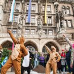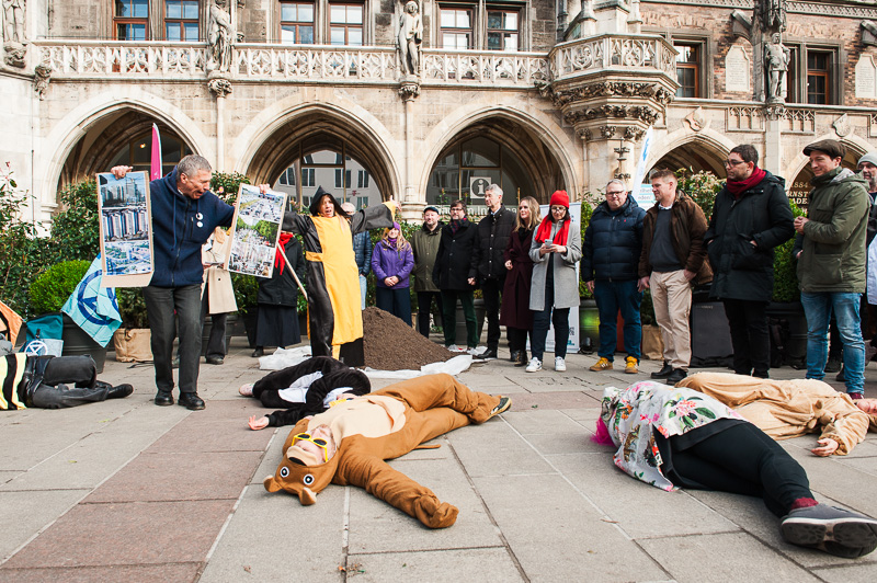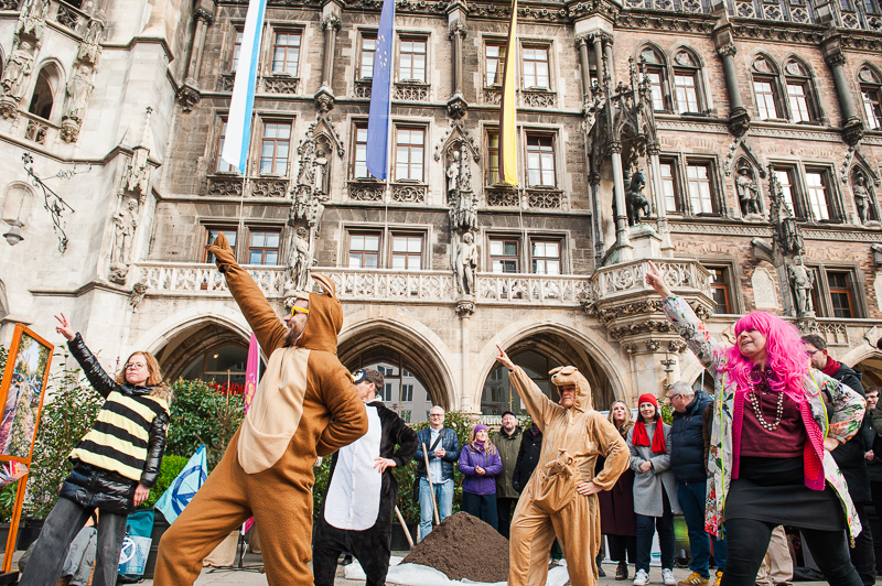 Die Übergabe wurde mit einem „Happening“ eröffnet. Mitten auf dem Platz stand ein symbolischer Miniwald, Paris grüßt. Davor tanzten Tiere zu „Stayin’ Alive“ von den Bee Gees. Ein Pinguin watschelte. Ein Känguru hüpfte. Eine Biene summte durch die Reihen. Dann trat eine Figur auf, die Neubauten und Straßen verkörperte. Sie drängte die Tiere zurück. Eines nach dem anderen fiel zu Boden. Schließlich erschien das Münchner Kindl. Es griff ein. Es holte die Tiere zurück ins Leben. Die Botschaft erreichte alle: So wie bisher darf es nicht weitergehen.