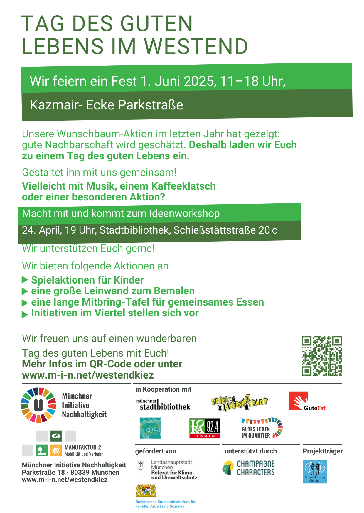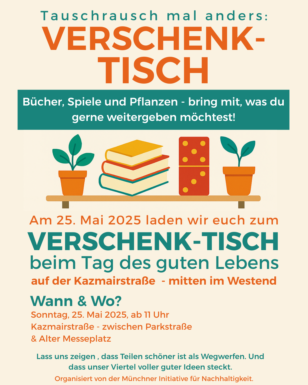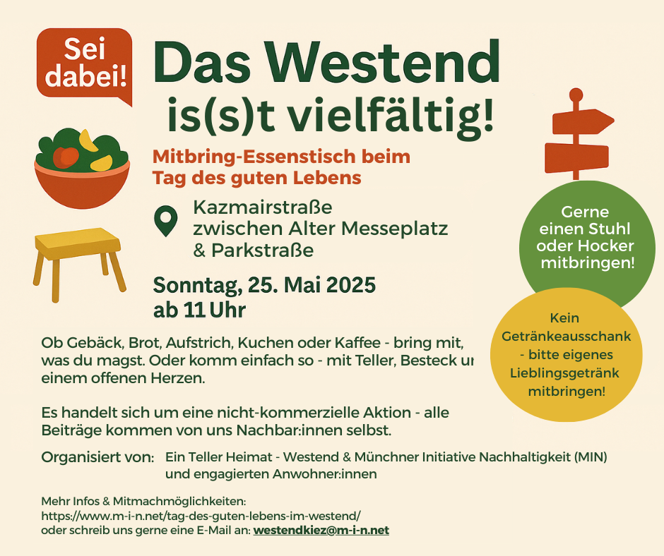 Unter dem Motto „Das Westend is(s)t vielfältig!” ist Platz für alles, was schmeckt: von selbst gebackenem Kuchen über bunte Salate bis hin zu Fladenbrot. Packt euren Picknickkorb und bringt Teller, Besteck und Becher mit – die Tafel steht – dank der Unterstützung der Augustiner Brauerei – bereit.