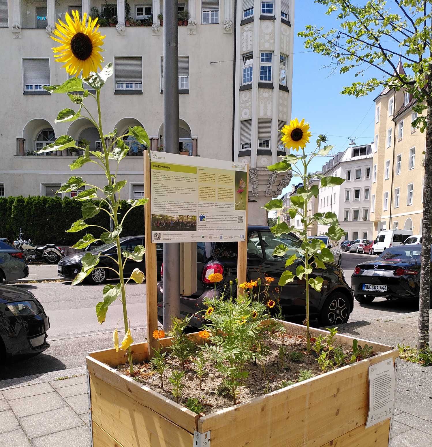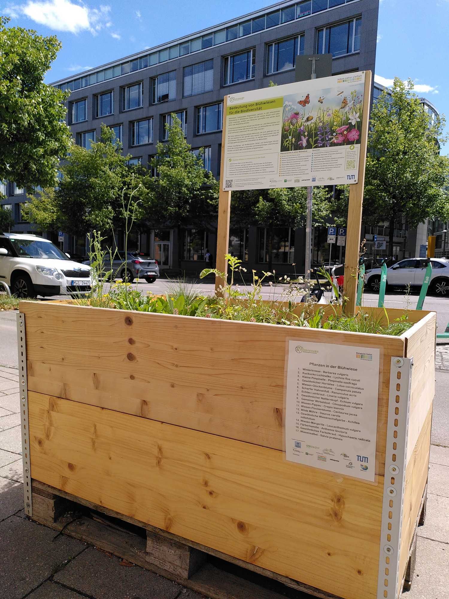 Ein weiteres Projekt: Fünf mobile Hochbeete am Alten Messeplatz, gebaut aus recycelten Materialien und bepflanzt von der TU München. Die geplante Wasserbank – ein Stadtmöbel, das Regenwasser nutzt – konnte bisher noch nicht umgesetzt werden.